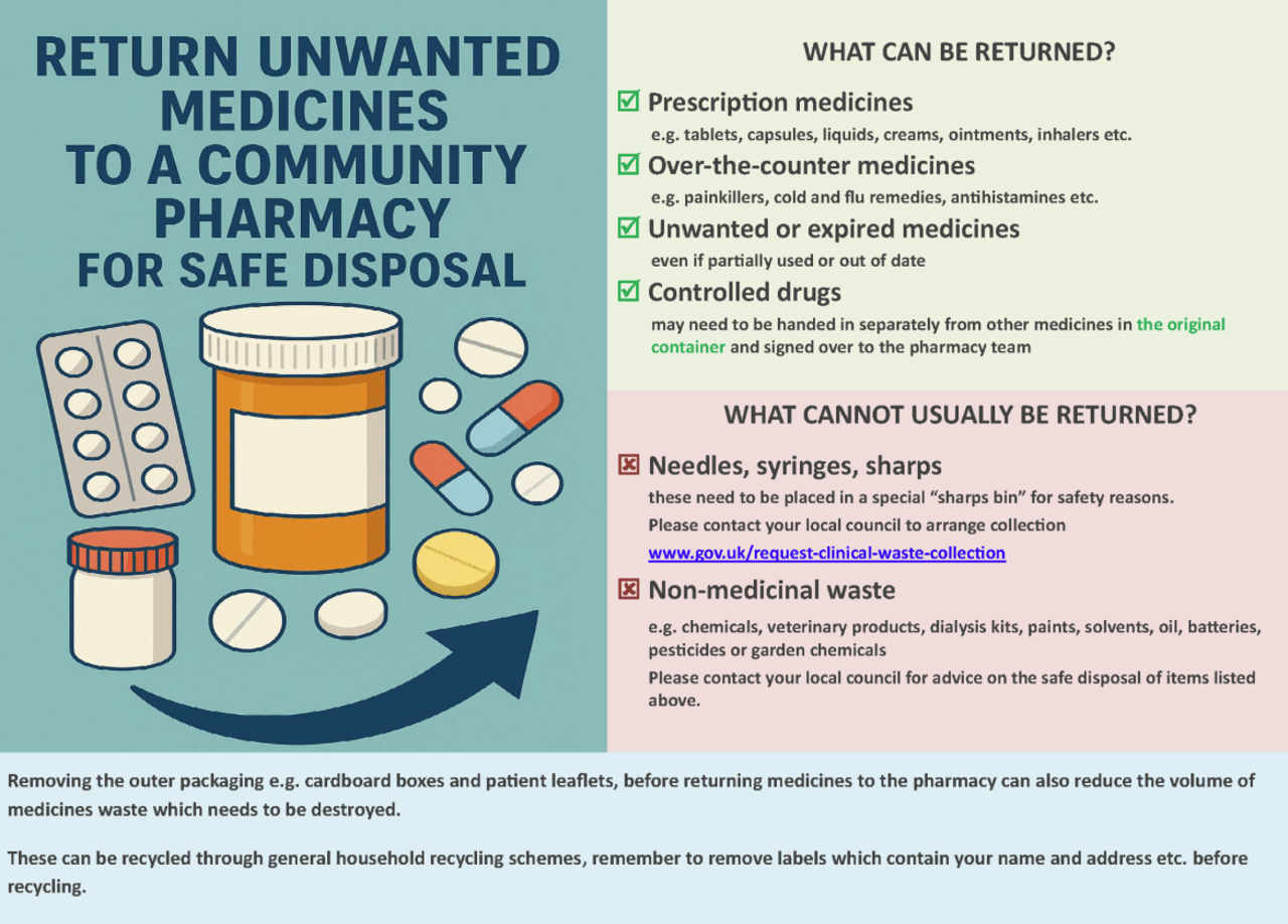 • Dispose of your unused medication appropriately – See what you can return to your local pharmacy for safe disposal when you no longer need them below:
