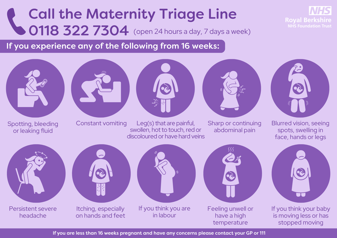 If you are over 16 weeks and are experiencing any of the below or have any other urgent concerns please call the triage line on 0118 322 7304.